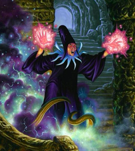 Kulan Gath wears long, dark, flowing robes. His eyes can become a glowing red color. He often wears a long dark hat on his head.